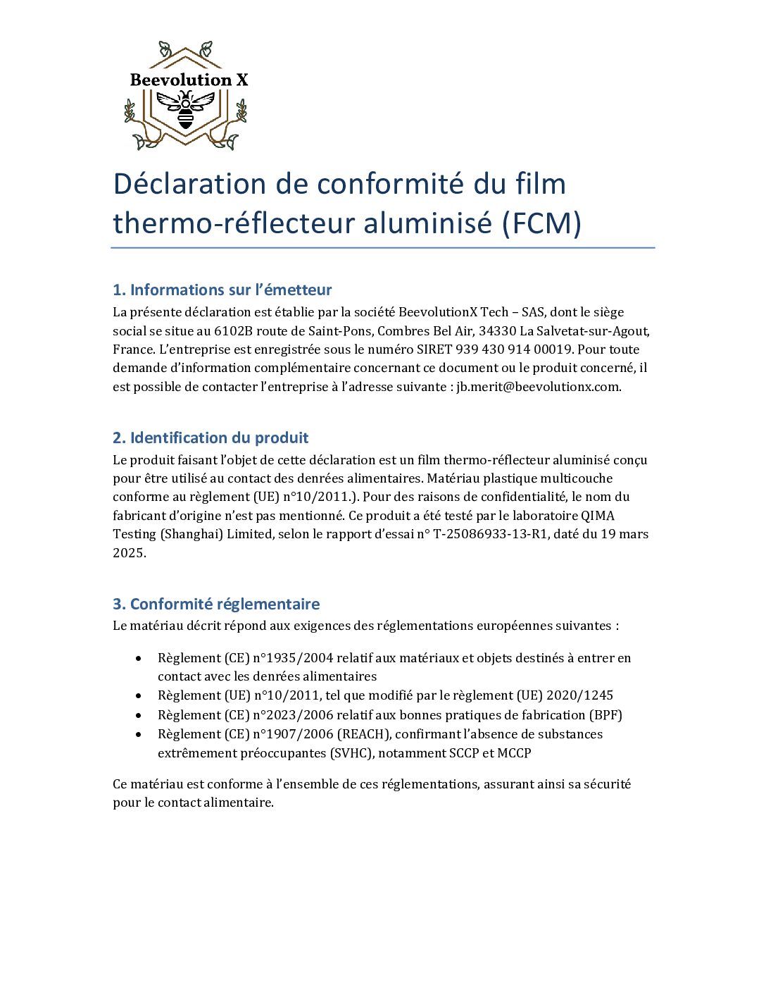 Le film thermo-réflecteur alimentaire BeevolutionX est certifié conforme au règlement (UE) n° 10/2011, garantissant une totale innocuité en contact avec les denrées alimentaires.